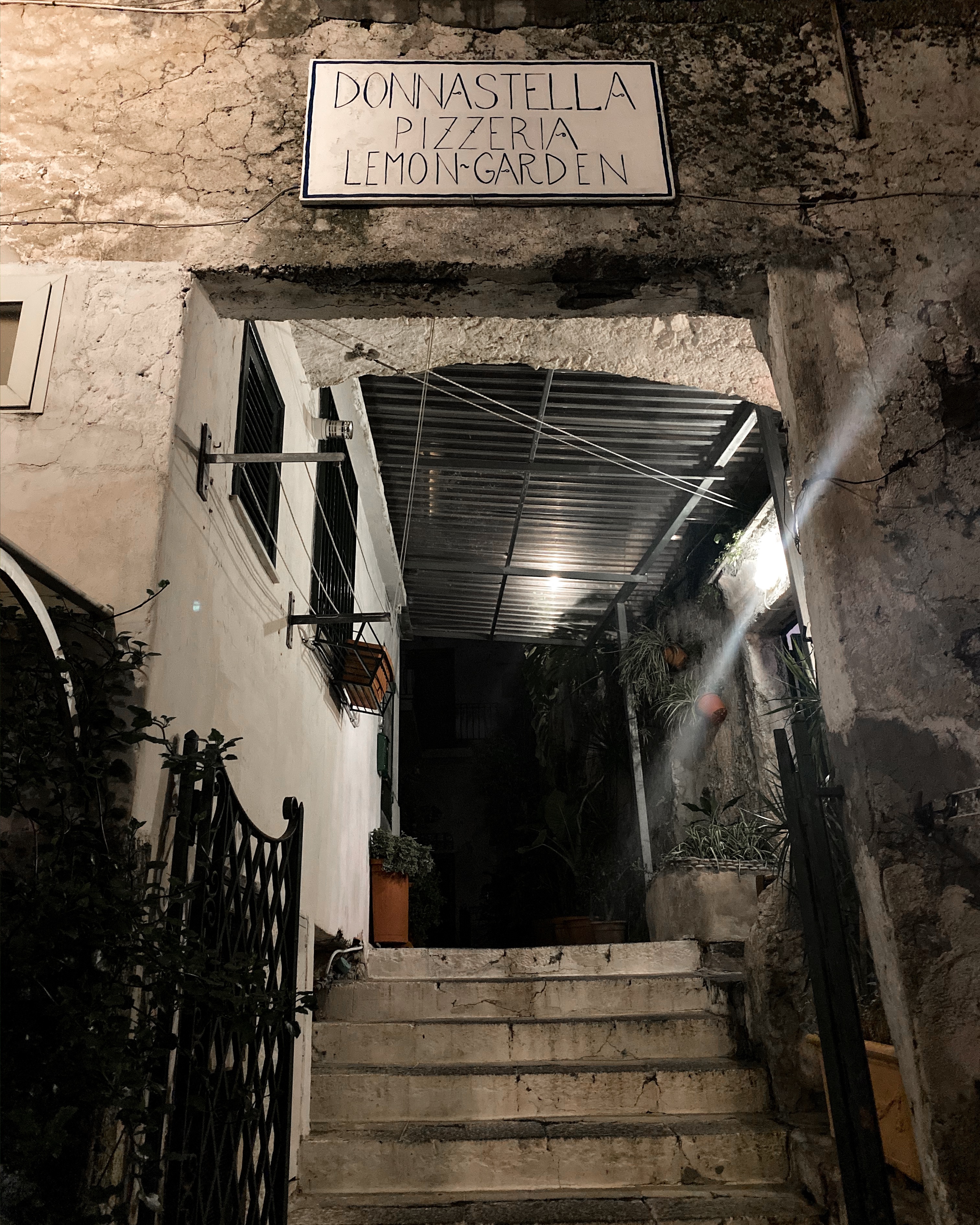 Once back at our hotel, we freshened up, then went down to the bar in our hotel and had a Spritz! Not entirely sure what this is but it’s tasty! Then we walked to downtown Amalfi and had dinner at Donna Stella Pizzeria. This is tucked back in a little alleyway and seemed like a place that mostly locals visited – which is a huge indicator that it’s good! We each ordered a pizza and ate the whole thing!