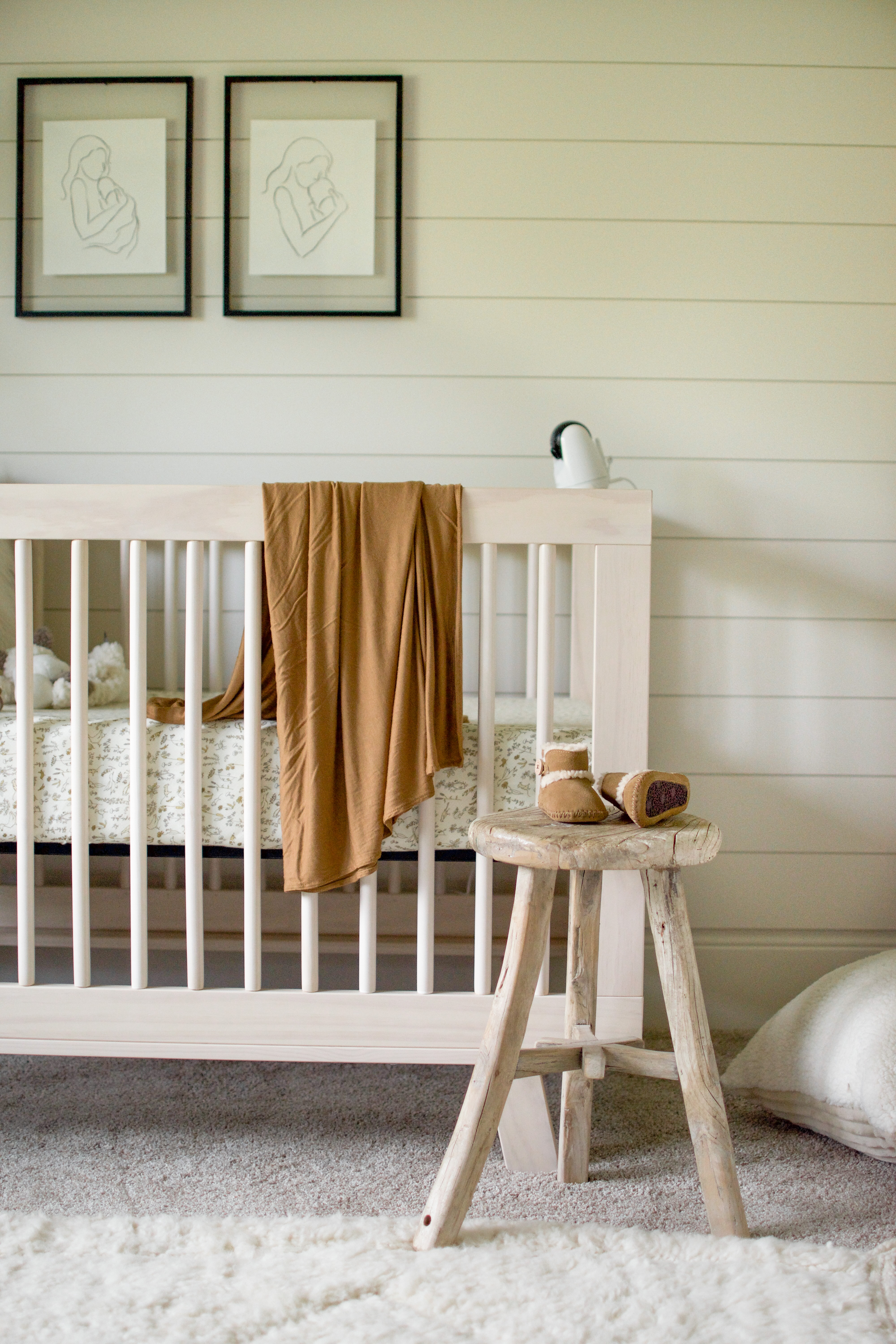 Let’s start with the walls. I knew I wanted some type of accent wall in her room and decided on shiplap. I chose this because it’s pretty timeless and gender neutral! We hired someone to do it for us because if Tommy and I attempted this via Youtube, we may have ended up in an argument haha. He did a great job and it took him about a day! The vinyl pieced shiplap material is available at Menards.